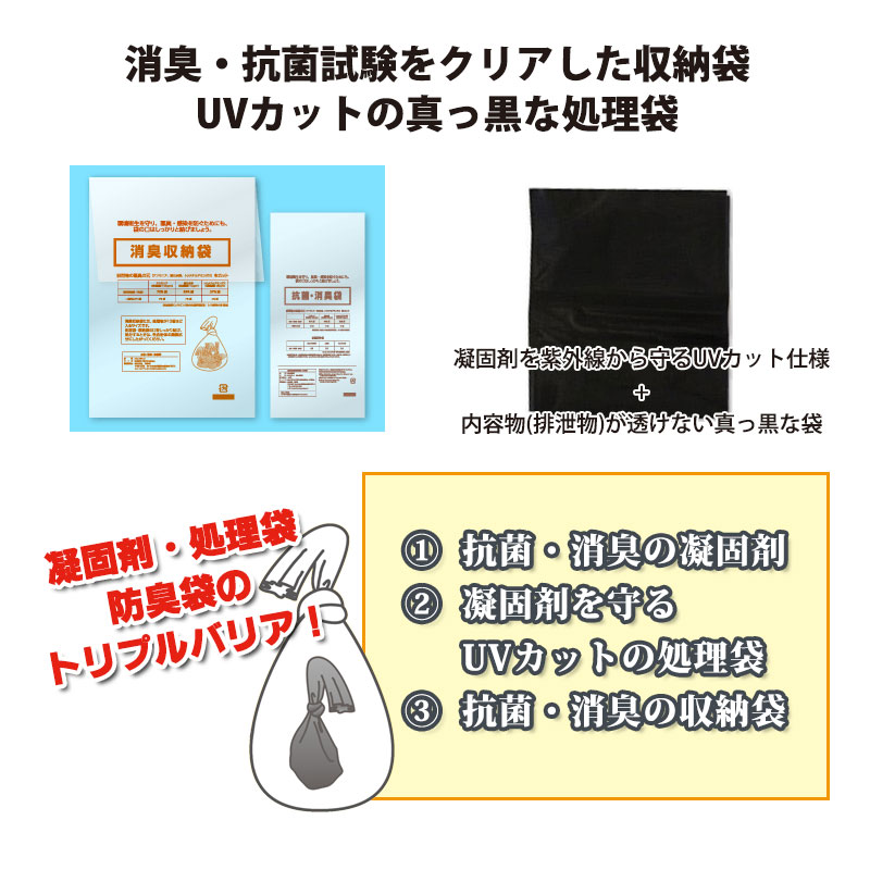 | 材質 | 【凝固剤】陽イオン性界面活性剤含 有抗菌・吸水性樹脂 【処理袋(黒)/消臭収納袋】ポリエチレン |