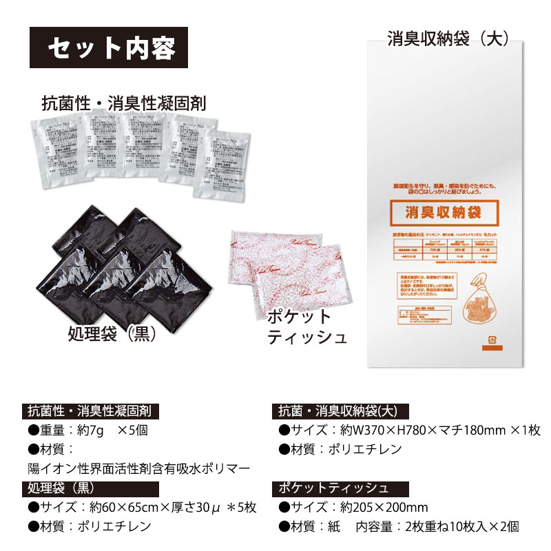 | セット内容 | 抗菌性・消臭性凝固剤:5個/処理袋(黒):5枚/消臭収納袋:1枚/ポケットテッシュ2枚重ね10枚入:2個 |